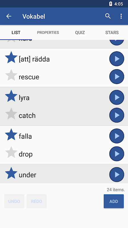 Puoi creare nuovi elenchi di parole all'interno dell'app o ovunque desideri. Vokabel è disponibile anche per Windows e puoi creare facilmente elenchi sul tuo computer e trasferirli sul tuo telefono o tablet. Potresti anche creare liste in un semplice editor di testo. Scrivi una parola nella tua lingua nella prima riga e la parola che vuoi imparare nella seconda riga. Ripeti l'operazione per le parole successive sulla riga tre e quattro, ecc. Puoi anche aggiungere sinonimi sulla stessa linea divisi per un asterisco "*".