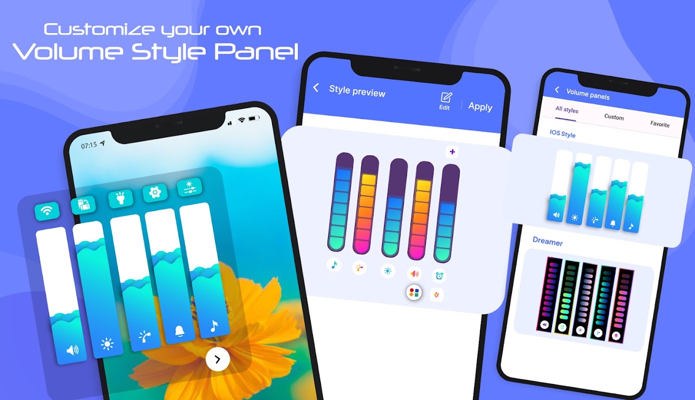 Applica il cursore del volume sullo schermo con l'elegante controllo del pannello del volume del colore RGB. Personalizza il volume del tuo telefono applica stili di volume e volume di controllo personalizzato. Imposta il pannello personalizzato di attraenti stili di volume del controllo del pannello del volume del telefono. Imposta lo stile del pannello del volume sullo stile del volume del telefono. Personalizza gli stili del volume del telefono con l'elegante controllo del pannello del volume. L'app di scorrimento del volume per il controllo del volume ha una serie di pulsanti di stile del volume. Il pannello di controllo del volume iOS può facilmente impostare lo stile del volume iOS sul tuo dispositivo.
