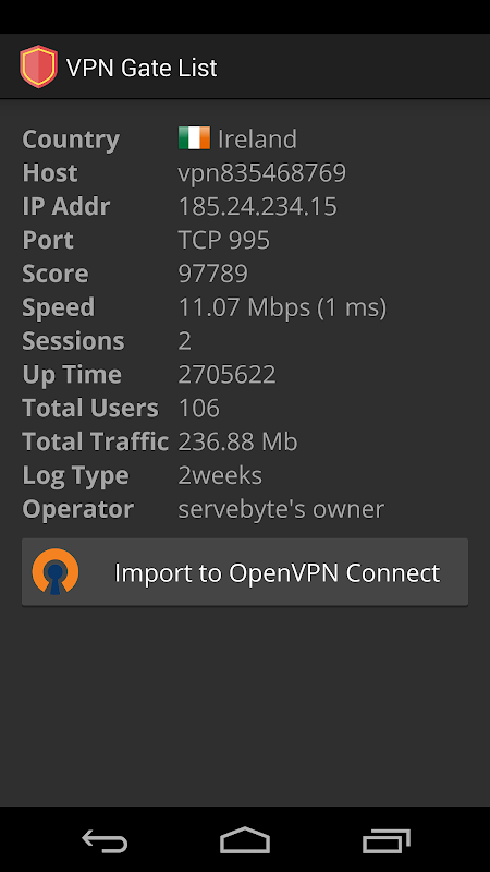 You have to use OpenVPN to connect. With it this will be the best VPN list you will ever get in Android! VPN Gate provides a list of public VPN relay servers that you and I can use. For more information visit http://www.vpngate.net/. If you prefer to connect using L2TP/IPsec VPN Protocol, refer to the following guide: http://www.vpngate.net/en/howto_l2tp.aspx