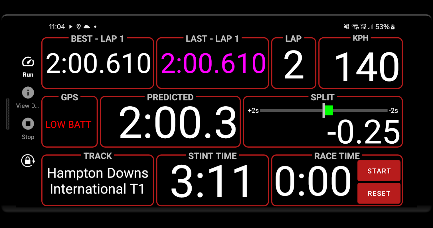 - Visualizza chiaramente i tuoi tempi sul giro, i tempi parziali in tempo reale e i tempi sul giro previsti, aiutandoti a prendere decisioni informate al volo.