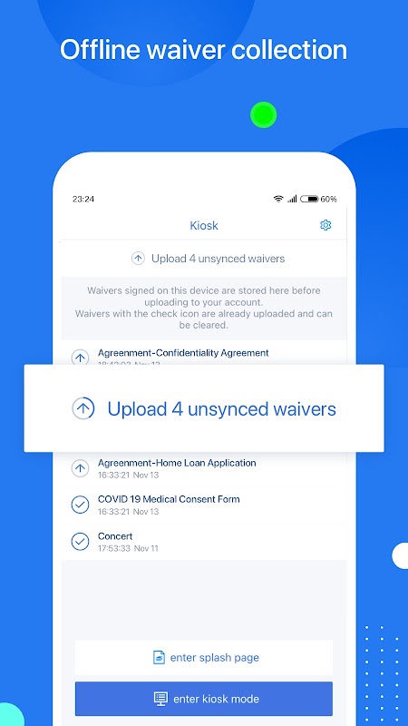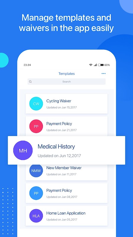 WaiverForever converte mucchi di dichiarazione liberatoria di responsabilità in documenti digitali che possono essere firmati elettronicamente. Scaricando l'applicazione WaiverForever, non solo si può trasformare il vostro iPhone e iPad in stazioni di firma di rinuncia, si può anche mantenere il vostro business organizzato nella nuvola per sempre e semplificare il vostro business attraverso una migliore comprensione dei clienti attraverso i dati raccolti da WaiverForever.