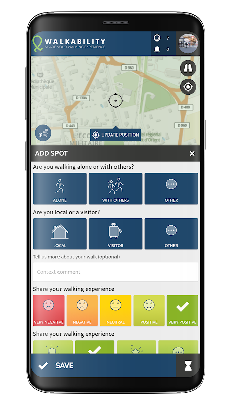 L'app Walkability consente ai cittadini di tutte le età e abilità di condividere le proprie esperienze di cammino. Ciò fornisce informazioni preziose per aiutare le comunità e le autorità responsabili a comprendere i luoghi percorribili a piedi e identificare le aree che necessitano di ulteriori miglioramenti per rendere la camminata migliore per tutti.