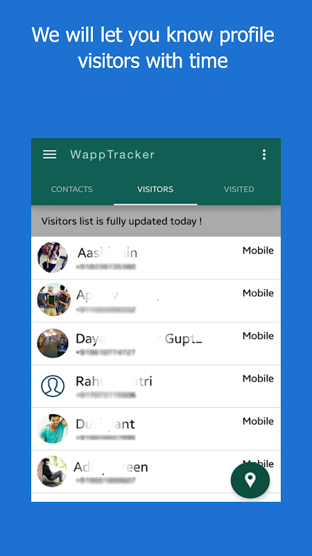 Visited: If you Visit someone else’s profile then those contacts will be shown in your Visited list. If you visited your friend's profile, then you will be appeared as a Visitor in your friend’s Visitor list. Thats how Whats Tracker app works.
