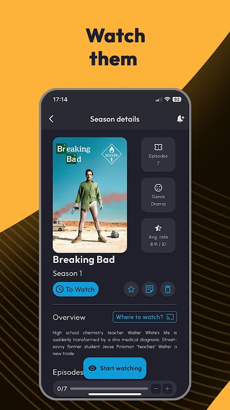 Organizza rapidamente ciò che vuoi guardare, monitora i tuoi progressi (Da guardare, In corso, Finiti) e valuta le tue scoperte per creare la tua cronologia di visualizzazione personale.