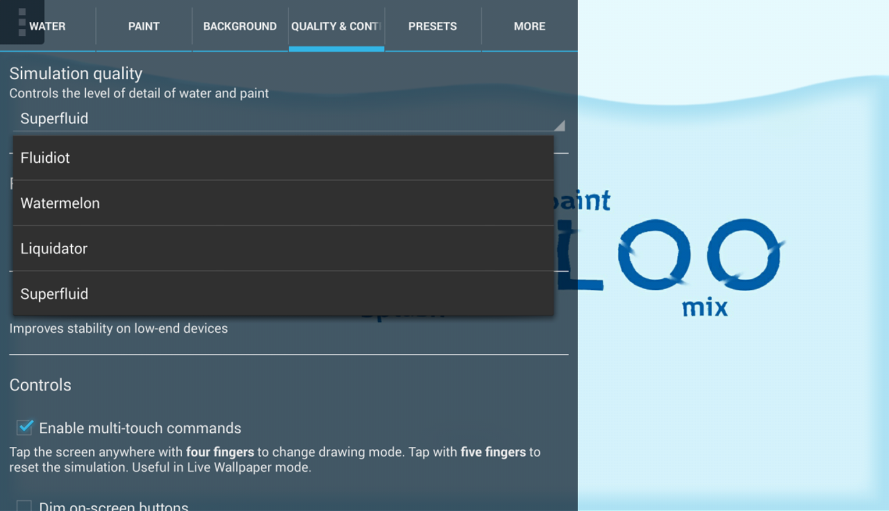 L'applicazione ha due modalità di interazione: acqua, dove "versare e splash", e vernice, dove "la vernice e mix".