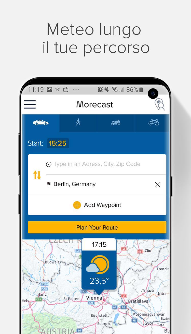 MORECAST™ offre una brillante app navigatore per aiutarti a scegliere il percorso migliore per evitare le brutte condizioni meteo.