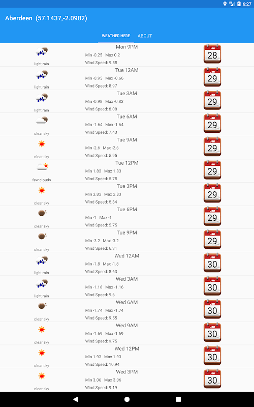 App meteo semplice e veloce, senza opzioni di fantasia ottiene semplicemente il tempo per la posizione corrente e mostra le proiezioni per i prossimi giorni