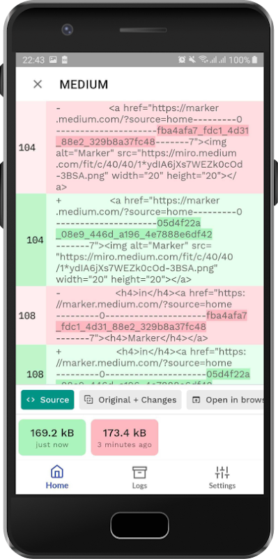 When a change is detected on background, a notification (alert) is displayed. It currently doesn't work with login pages, but contributions are welcome. There are 3 viewers for the app, a text viewer that compares website history in a git-like way, with line by line added/removed and green/red, a pdf viewer which displays multi-paged PDFs on a carousel like interface, inspired by Lottie's open source sample app, and an image viewer, similar to the Pdf viewer, but with support for tiling (which allows heavy pictures to load faster and with lower memory).