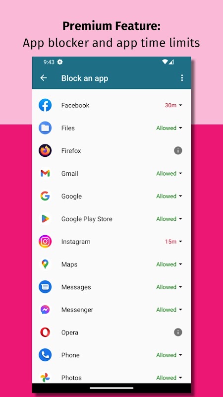 Trascorriamo tutti un po' troppo tempo sui nostri dispositivi e alcuni di noi fanno davvero fatica a metterli giù. La nostra tecnologia di controllo delle app può bloccare o impostare limiti di tempo giornalieri su qualsiasi app installata sul tuo dispositivo Android. Hai app su cui trascorri troppo tempo? Imposta un limite di tempo giornaliero per liberarti dalle app che fanno perdere tempo in categorie come giochi, social media e piattaforme di streaming.
