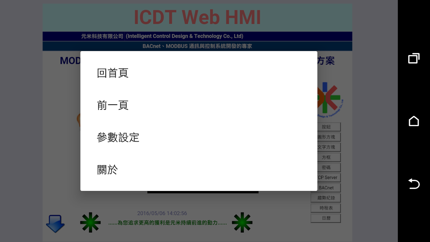 ICDT Web HMI 圖控系統除了可以在 Windows 電腦上達到監控人機介面功能,也可以透過電腦或手機的瀏覽器進行操控。Web HMI 瀏覽器 為針對 Android 的手機或平板上開發針對 ICDT Web HMI 網路瀏覽操作專用的 APP,除了可以自動或手動調整畫面大小、顯示方向外, 還可以在背景執行時監看警報狀態,提示警報資訊。