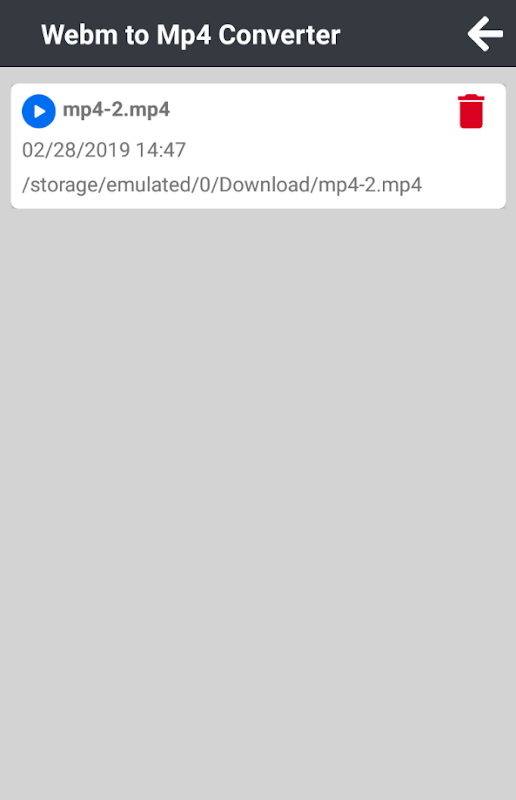 Con questo facile da usare webm per convertitore mp4 devi solo selezionare il tuo file webm e fare clic sul pulsante di conversione. Riceverai il file mp4 convertito in pochissimo tempo in base alla lunghezza del tuo file video webm di input. Da WEBM a MP4 Converter include una libreria che elenca tutte le conversioni. È possibile riprodurre o rimuovere file dalla libreria come si desidera. Buona conversione :).