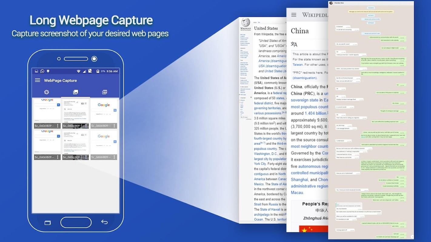 Web page Capture allows you to capture longshot of any online book or novel and then save it as PDF file for later reading. It allows you to save a large amount of data in a single view. You can also save friends Facebook profile, comments, pictures in Twitter as a whole in just one view and then share them with your friends via WhatsApp, Messenger, Twitter or Facebook etc.