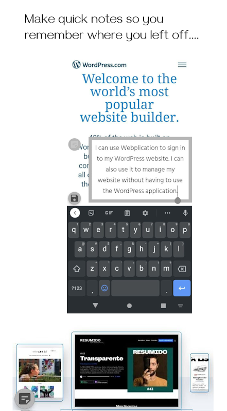 Webplication è stato creato per darti un po' di respiro sotto forma di sandbox di un sito Web con tutta la necessità di un'applicazione. Immagina che il tuo sito web preferito non abbia un'applicazione sul Google Play Store. Ora puoi fare un'applicazione usando solo il loro sito web. Webplication creerà tutta la sensazione di un'applicazione e tutta la potenza di un'applicazione web con la produttività per farti gestire rapidamente i tuoi affari. Naturalmente, sono state apportate alcune semplici aggiunte per aumentare la tua esperienza utente, incluso un blocco note rapido, dove puoi prendere appunti, in modo da poter annotare mentre navighi.