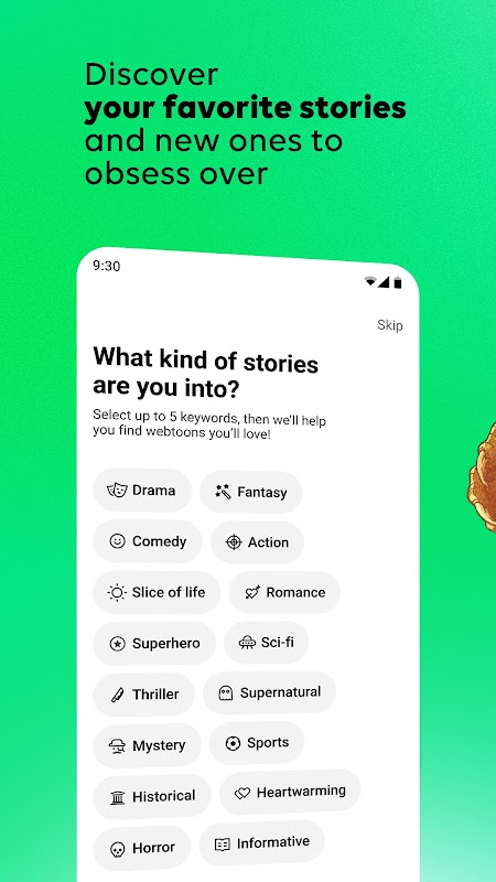 - Esplora la più ampia selezione al mondo di webcomic che spaziano tra generi diversi come azione, romanticismo, thriller e tutto ciò che sta nel mezzo.