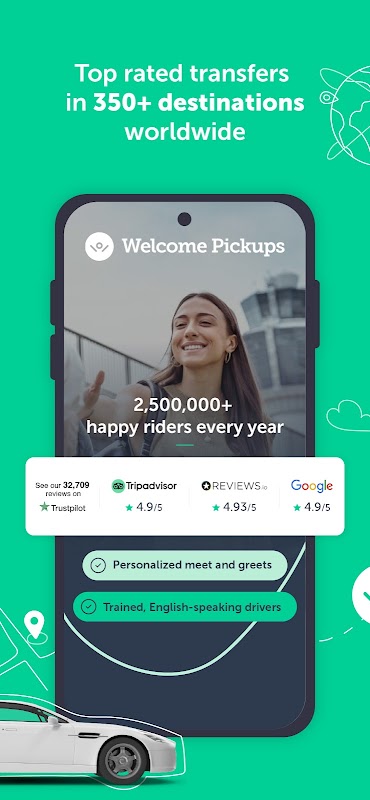 Con Welcome Pickups puoi prenotare trasferimenti a 5 stelle in oltre 360 città. Dai trasferimenti da porto e aeroporto alle corse da città a città, abbiamo tutto ciò che ti serve. La nostra app intuitiva ti permette di prenotare e gestire trasferimenti privati, accedere agli extra di viaggio, contattare l'assistenza clienti e chattare con il tuo autista, il tutto da cellulare o tablet.