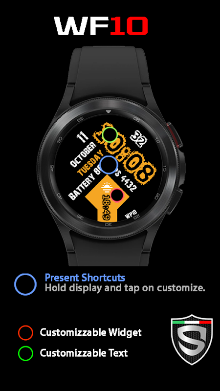 WF10 ANGLES, Questo Volto nella sua semplicità ci porta a vedere il mondo da diverse angolazioni. Ci sono ora, data, conteggio dei passi, percentuale della batteria. Ha anche un widget personalizzabile e una combinazione di colori.