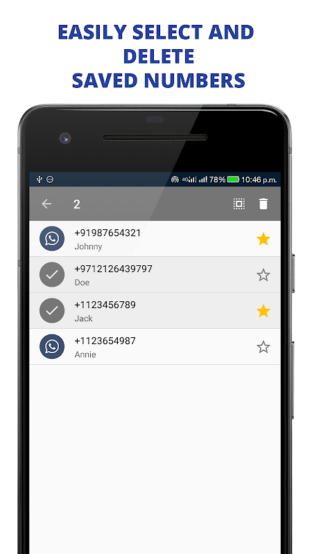 This app is not related to WhatsApp Inc. This app uses the public API provided by WhatsApp to open a chat with any number. The names and numbers saved in the app is created and saved locally, so if you uninstall the app, clears data, or delete number it is lost permanently. We are not saving any numbers in our servers. Also it is job of the users to ensure the number is correct.