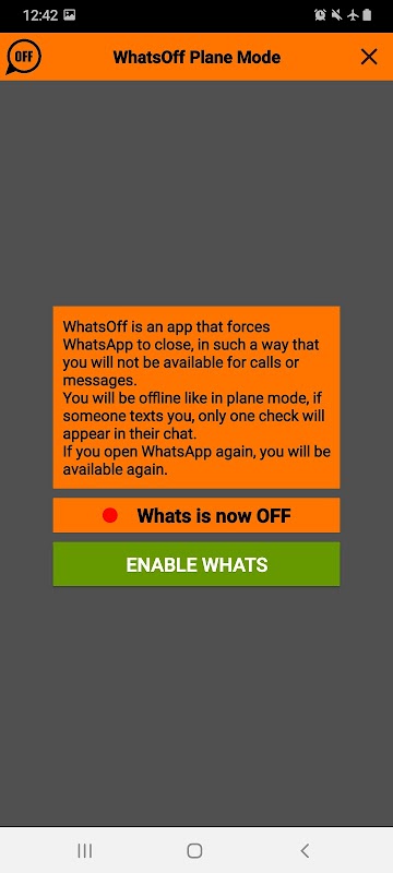 - WhatsOff è un'app che forza la chiusura di WhatsApp, in modo tale da non essere disponibile per chiamate o messaggi.