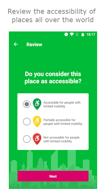 Anche se non hai mobilità ridotta, puoi usare Wheelguide per classificare i posti. Aiuterai milioni di persone che vogliono andare da qualche parte, ma non sai se saranno in grado di entrare, come gli utenti su sedia a rotelle.