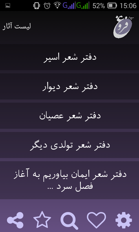 جستجو : با جستجوی کلمه مورد نظر در تمامی اشعار , لیست مصراع های یافت شده بر اساس کلمه مورد نظر به شما نشان می دهد و با انتخاب هر یک از مصراع ها به شعر مربوط به نمایش در می آید
