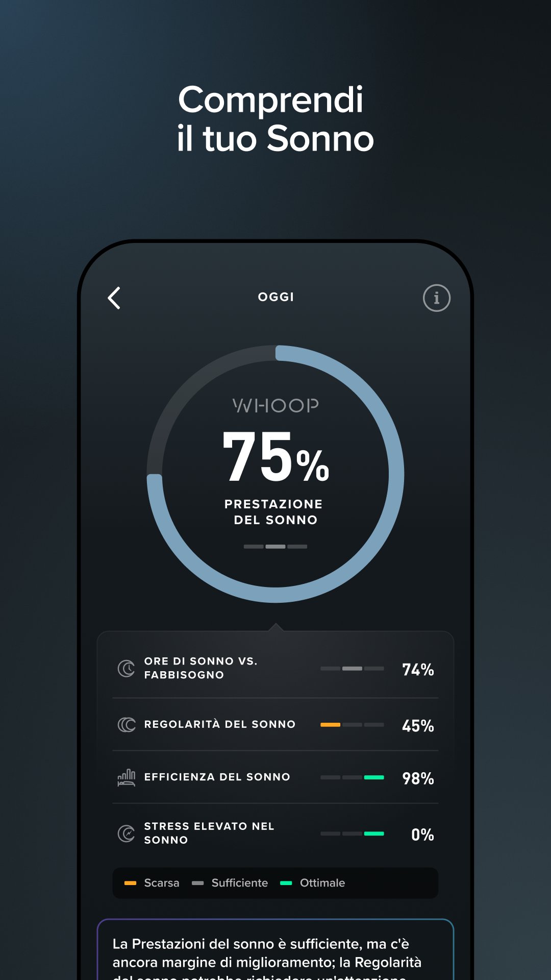 WHOOP offre prodotti e servizi progettati per scopi di fitness e benessere. I prodotti e i servizi WHOOP non sono dispositivi medici, non sono destinati a trattare o diagnosticare malattie e non devono essere usati come sostituto di una consulenza, una diagnosi o un trattamento medico professionale. Tutti i contenuti WHOOP vengono forniti solo a scopo informativo.