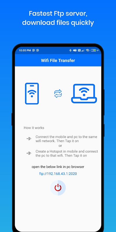 Wifi File Transfer ti consente di trasferire file come musica, foto, video, documenti, qualsiasi tipo di file dal dispositivo Android al PC tramite rete Wi-Fi. Non c'è bisogno di internet, basta collegarsi alla stessa rete wifi del PC o accendere l'hotspot in mobile e collegare il PC a quel wifi. È sufficiente condividere i file interamente in modalità offline.