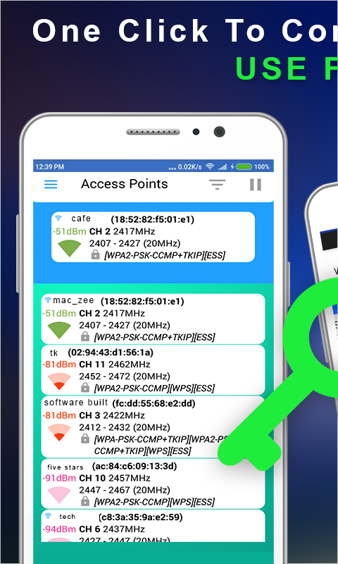 Questa app funziona come visualizzatore chiave Wi-Fi, visualizzazione chiave password Wi-Fi, gestore connessione Wi-Fi, analizzatore Wi-Fi, potenza del segnale Wi-Fi, test della velocità Wi-Fi, misurazione della velocità Wi-Fi, chiave Wi-Fi di ripristino, valutazione del canale, forza del segnale di scansione, potenza del segnale Wi-Fi , analizzatore wifi e molto altro ancora.