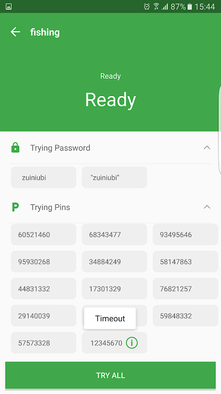 2. Nella pagina di dettaglio, possiamo cliccare sul pulsante 'provare tutti' di provare tutte pin non testati e password. Siate pazienti, può costare qualche minuto.