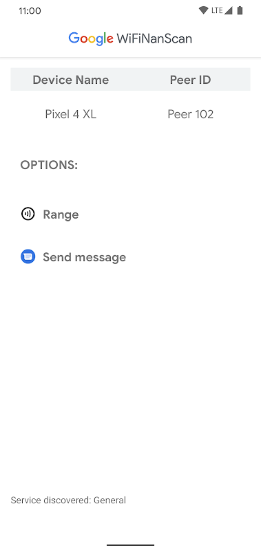 L'app WifiNanScan misura la distanza tra due smartphone utilizzando il protocollo Wi-Fi Aware (chiamato anche Neighborhood Aware Networking (NAN)). È progettato come strumento di ricerca, dimostrazione e test per sviluppatori, fornitori, università e altro ancora. Con questa app è possibile ottenere una misura della distanza con una precisione di circa 1 metro con telefoni distanti fino a 15 metri. Sviluppatori, OEM e ricercatori possono utilizzare questo strumento per convalidare le misurazioni di distanza / distanza consentendo lo sviluppo di una gamma peer-to-peer e il trasferimento dei dati, trovare il mio telefono e applicazioni sensibili al contesto basate sull'API WiFi Aware / NAN. (Vedere anche WifiRttScan.) Il telefono deve essere un modello / sistema operativo che supporta WiFi RTT affinché questa app funzioni.