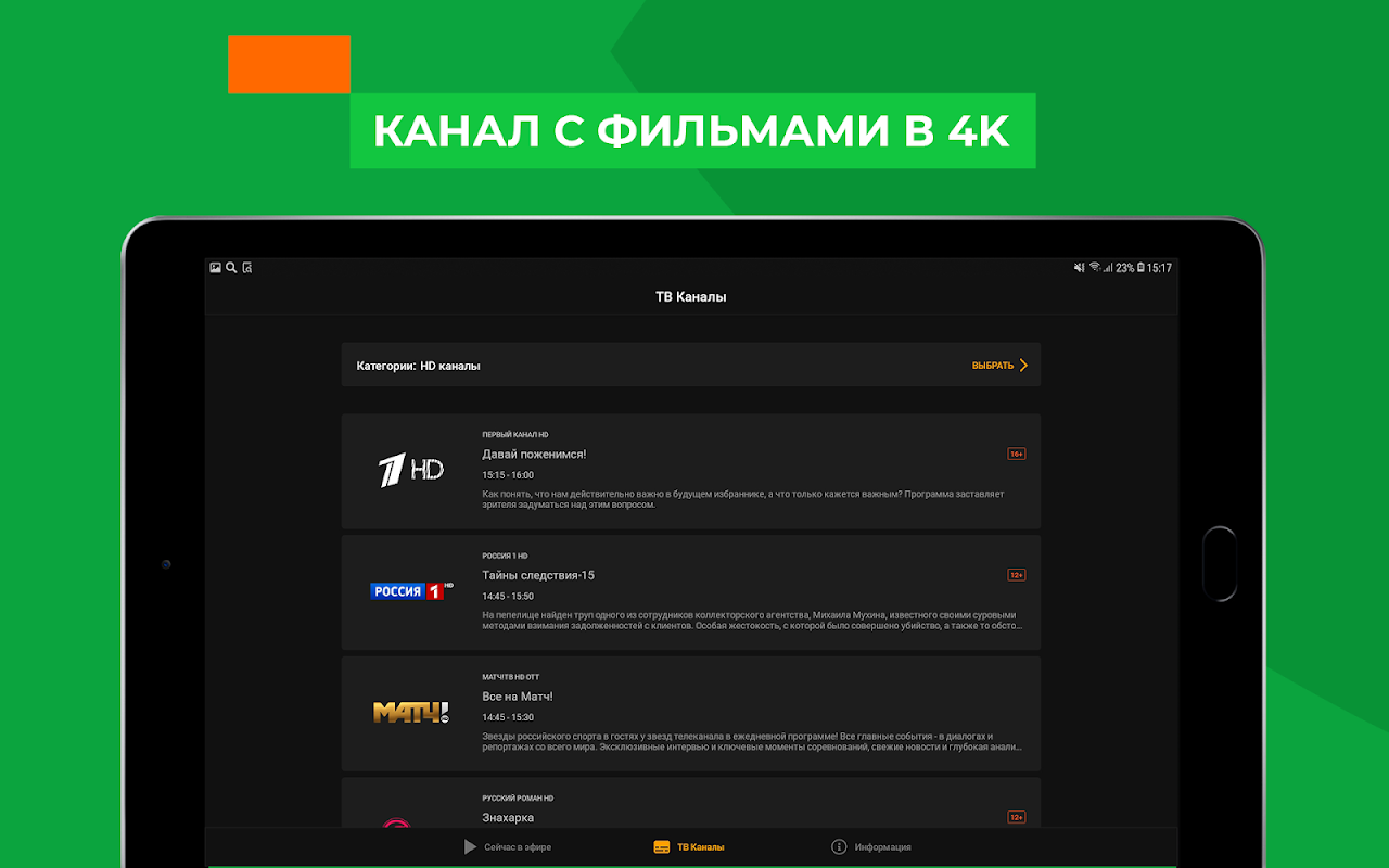 Сервис дает бесплатный доступ к онлайн-просмотру до 140 телеканалов: Первый канал, ТНТ, Про Бизнес, Жара HD, Music Box RU, RT HD, Мир 24, Открытый мир, Доктор, Disney, О!Кино и многие другие. Коллекция каналов постоянно расширяется.