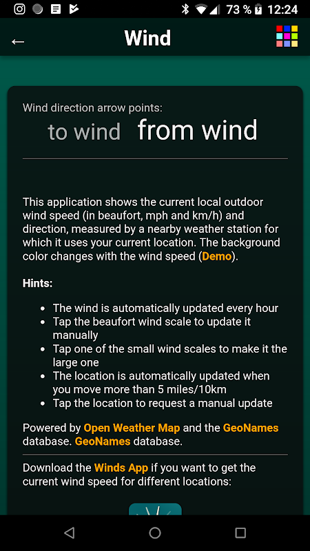 Vuoi andare a vela, windsurf, bicicletta, kting, drone volante o appena fuori dalla porta? Questa applicazione mostra l'attuale velocità del vento esterno locale (in beaufort, mph, km / h, m / se nodi) e la direzione, misurata da una stazione meteo vicina per la quale utilizza la posizione corrente.