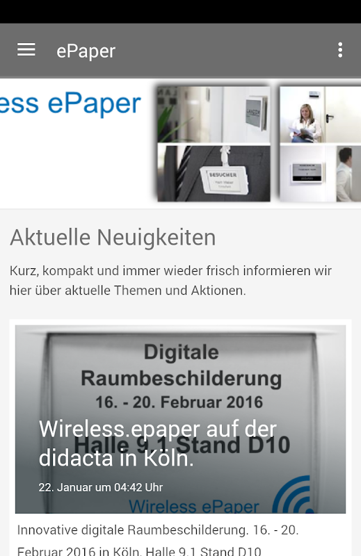 Ob als digitale Raumbeschilderung, Preisauszeichnung oder Menükarte, mit den LANCOM Wireless ePaper Displays verleihen Sie Ihrem Unternehmen einen attraktiven und modernen Look. Dabei sind die Displays ebenso flexibel wie praktisch, denn die Pflege erfolgt ganz automatisch über eine Schnittstelle zum Kalender- und Warenwirtschaftssystem. Damit werden Arbeitsabläufe automatisiert und Ihre Gesamtbetriebskosten gesenkt. Die Displays bieten einen echten Informationswert und schaffen damit Transparenz. Und jetzt gibt es "Wireless ePaper" als Smartphone App. Lade dir die App kostenlos aus den Stores und du erhältst alle wichtigen Informationen direkt auf deinem Handy.