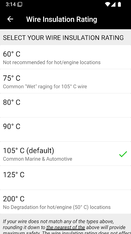 WireSizer calcola automaticamente la sezione minima del cavo richiesta per il circuito (presupponendo l'uso di filo di rame), tenendo conto della caduta di tensione dovuta alle condizioni di installazione e di temperatura. I risultati vengono confrontati con i limiti di portata di corrente (amperaggio) per evitare l'utilizzo di cavi sottodimensionati non sicuri.