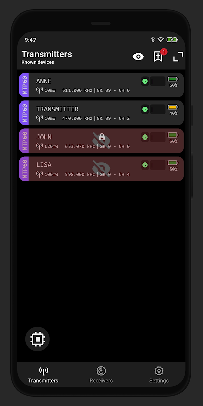 Avvia l'App per monitorare e controllare i parametri tra cui: batteria rimanente, nome del canale, livelli RF e audio, gruppo di canali, frequenza e altro.