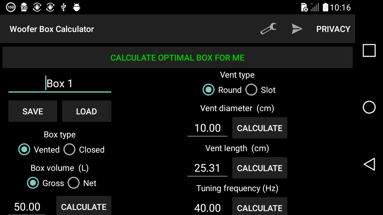 This app will help you design enclosure (box) for your car audio speaker (sub woofer). It was developed by 2012 and 2013 european champion in dB Drag Racing and was designed to be easy and transparent.