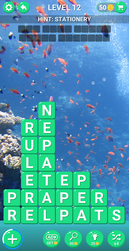 Each levels provide different difficulty. Game levels is divided in some theme appearance such as rain, winter, night, and many more. Correct swipe the letters horizontally, vertically to form a specific hidden word.