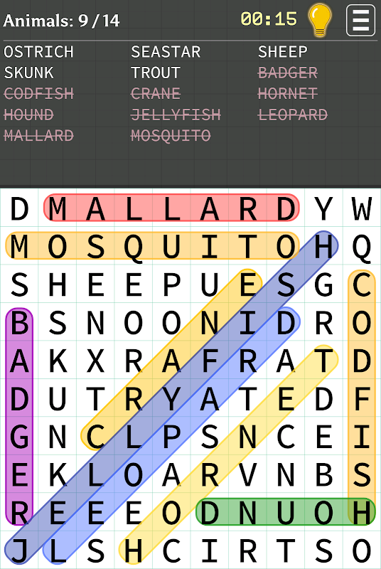 ◉ Parole: la parola tradizionale trova la modalità di gioco. Trova tutte le parole dalla lista nel più breve tempo possibile.