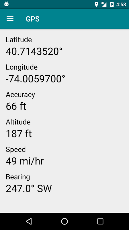Usa la funzione GPS per ottenere informazioni sulla posizione non elaborate. Sono disponibili latitudine, longitudine, precisione della posizione, altitudine, velocità e rilevamento. Qualunque cosa invii il provider di localizzazione (GPS o rete), verrà visualizzata questa schermata.