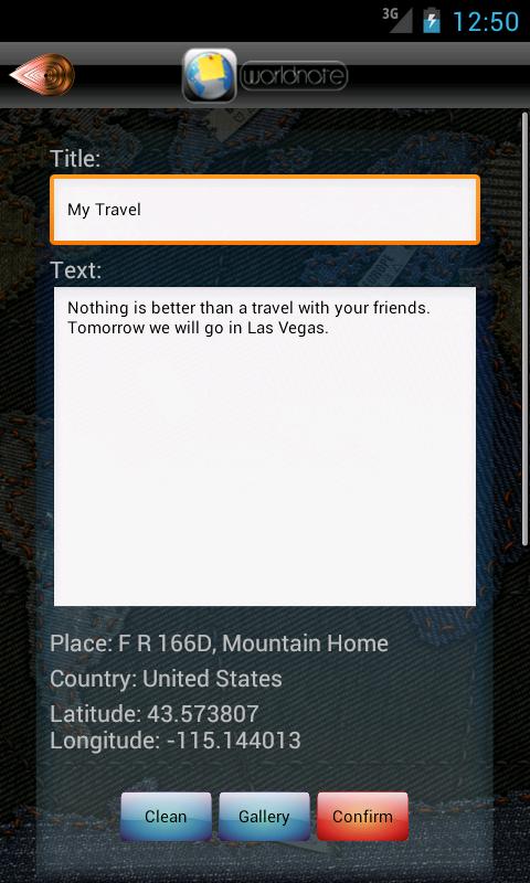 Con Worldnote puoi creare note basate sulla posizione geografica. L'app e' l'ideale per annotare tutto su cosa hai fatto, quando l'hai fatto e dove l'hai fatto, comodissima nei viaggi o nelle escursioni. I dati di posizione possono essere catturati automaticamente con un semplice click nel posto di tuo interesse o tramite GPS(se disponibile) oppure è possibile anche eseguire una ricerca di un posto o un indirizzo preciso tramite parola chiave. Le tue note saranno visibili su una mappa GPS o consultabili in un elenco ordinato cronologicamente. Puoi inoltre creare una galleria di immagini per ogni nota per meglio rievocare il momento e vedere dati di posizione extra come l'altitudine.