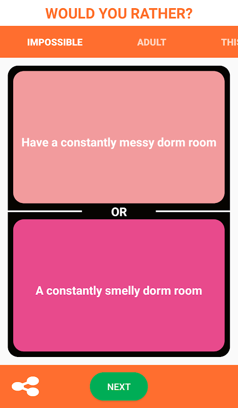 This is a funny and interesting game that you can play in a party with your classmates or friends. In this game there are thousand plus questions in many categories, such as popular, impossible, love, party, hard, funny, life, food, silly, ridiculous, dating, this or that and many more. All the questions in the games are in the same sentence structure "Would you rather do A or do B?". And you can make your choice to see how many people choose the same answer as you. When you see the result you will be shocked by it.