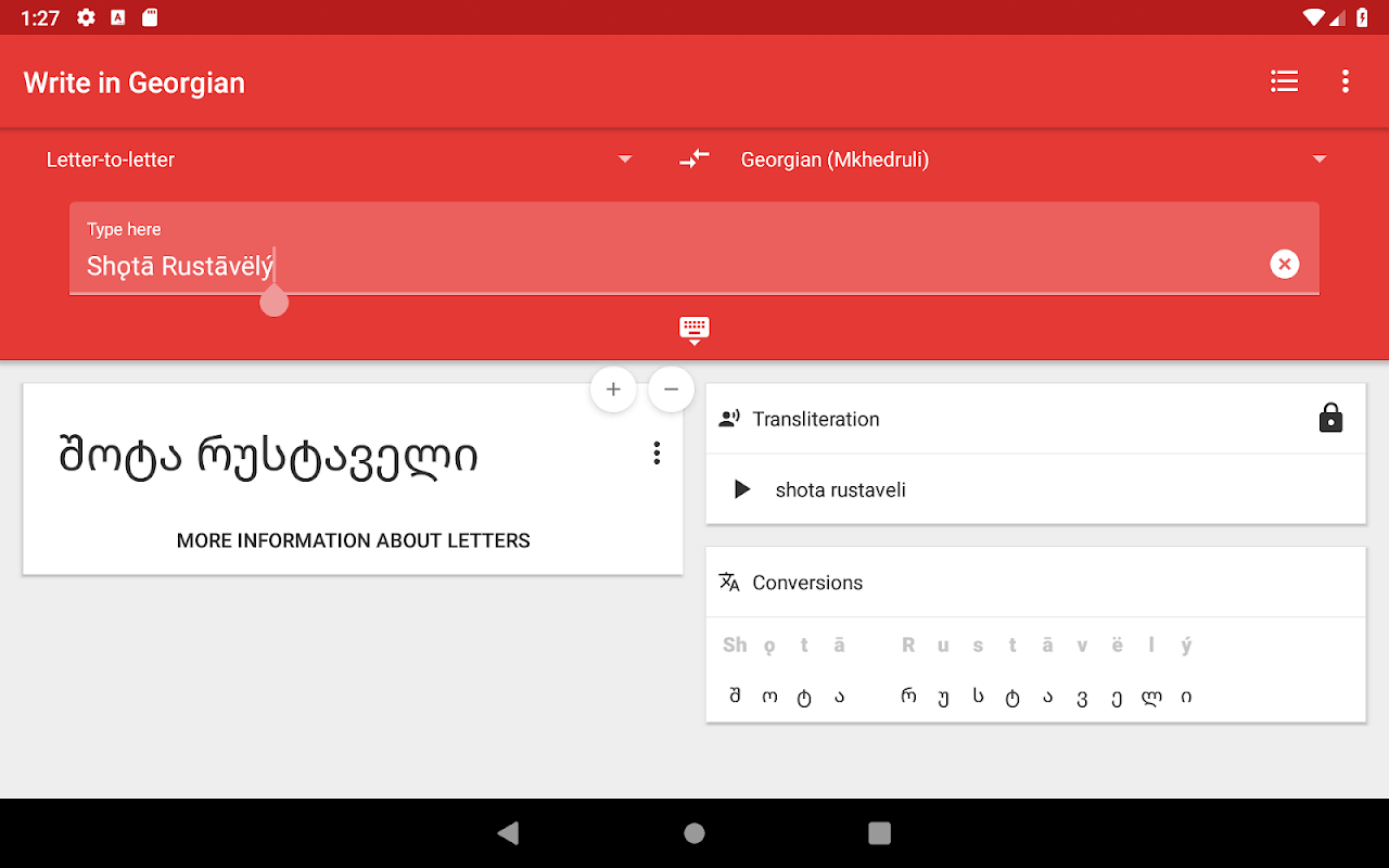 Questa app traslittera tra le lettere latine/cirilliche e l'alfabeto georgiano. Clicca su una parola per ottenere corrispondenze approssimative dal dizionario georgiano e una traduzione.
