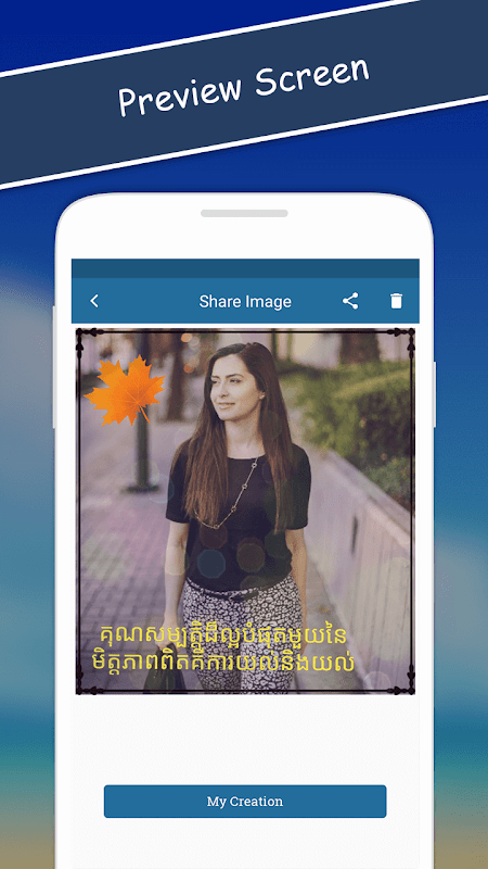 Khmer Photo Text Editor with Khmer Keyboard contains multiple stylish fonts and 50 colors which can be useful to create gradient color on a text and shadow to the background of a text. Write Khmer on Photo : សរសេរជាភាសាខ្មែរ includes 100+ HD photos to create a quote photo and also includes 100+ quotes in the Khmer language or you can write Khmer poetry on photo. Write Khmer Text on Photo also contains 25+ beautiful overlays and 25+ latest frames to create wonderful images.