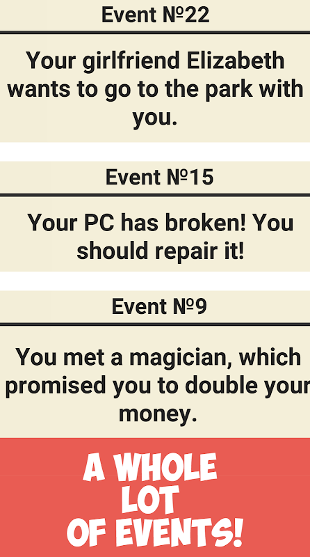 -Random events: you can go shopping and accidently lose your money, or you might get robbed, or you can find some money. And there is a whole lot of different random events out there!