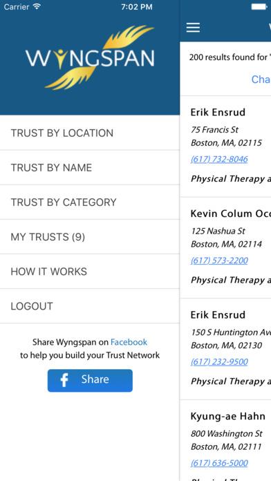 Wyngspan allows community members to build a Trust Network for themselves by finding and sharing the professionals and businesses they trust for categories like Insurance, Dentists, etc. Each professional and business has a Trust Factor®, which is based on the quantity/quality of Trusts received. This simple community can create peace of mind by eliminating the need to look through review sites, scan search engines, make social network posts, etc.