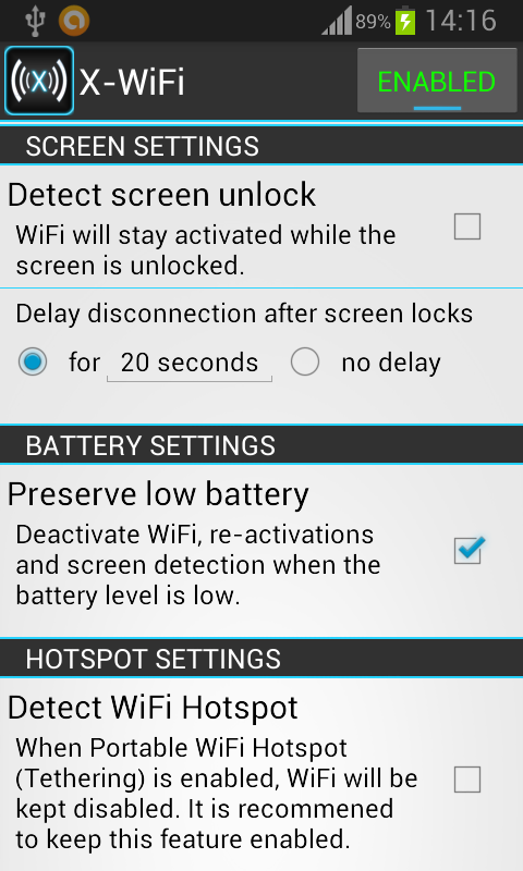 X-WiFi is an application suitable for tablets, smartphones and all devices that have WiFi. It has been developed specifically for WiFi devices to provide an intelligent and easy way to control the device's connectivity. The application helps the user to manage WiFi activations and deactivations based on his settings and saves battery, especially when the battery level is low. Feel free to send us your feedback and to report any bugs!