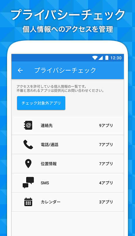 ・不審なアプリがプライバシー情報にアクセスしていないかを分かりやすくチェックできるからあんしん!