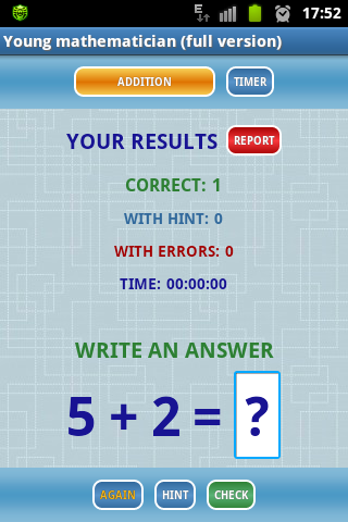 È possibile utilizzare questo programma per formare e testare le conoscenze dei bambini in età scolare o superiore. Il programma ha cinque modalità: addizione, sottrazione, moltiplicazione, divisione e confronto. Ogni modalità del programma ha impostazioni individuali, che consentono di controllare il livello di complessità. In caso di difficoltà è possibile ottenere un suggerimento. I risultati verranno memorizzati in tre categorie: risposte giuste, risposte con suggerimenti, risposte errate. Inoltre, puoi vedere tutta la storia delle risposte e il voto finale del bambino.