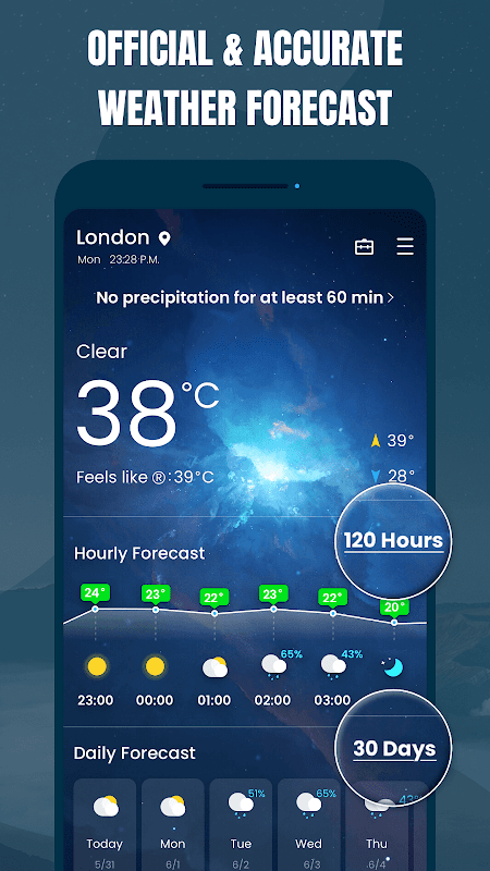 Se consenti all'app meteo di ottenere la tua posizione. Riceverai automaticamente il tuo tempo locale in tempo reale e informazioni dettagliate sul tempo in 30 giorni. Oppure puoi modificare manualmente la tua posizione.