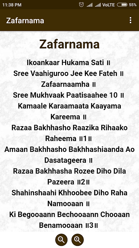 Consente di leggere Zafarnama Bani in Gurmukhi e inglese.