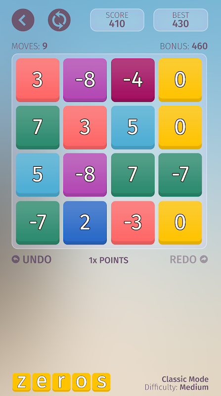 Zeros is a fun and challenging puzzle: Move blocks to perform addition. But be careful, blocks can't go over 9 or below -9. Connect 4 zeros to level up. Magic blocks will help you along the way.